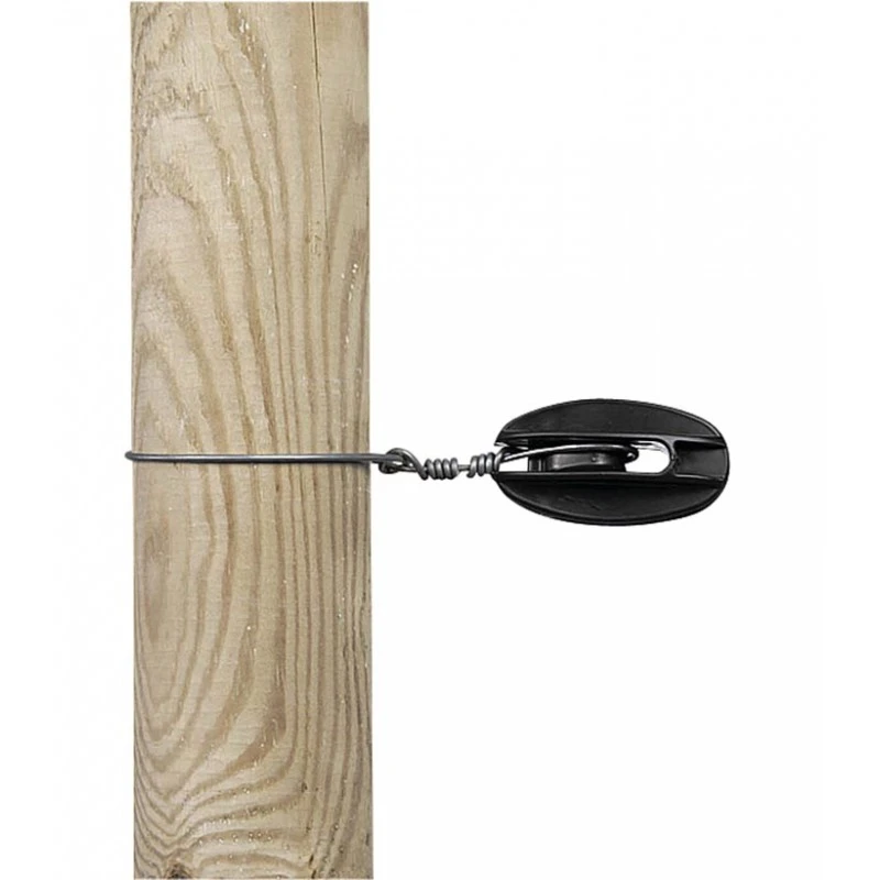 Zeer sterke kunststof isolator voor houten paal. Geschikt voor cord en draad (HT & kunststof). Bevestiging aan een begin- of eindpaal voor het opspannen van draden om de afrastering strak te houden. Supersterk door uitvoering in polycarbonaat