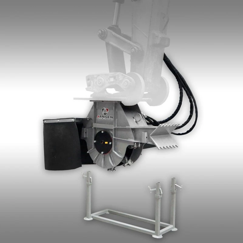 De machine is ontworpen voor de aanbouw aan uw graafmachine. De stobbenfrees BSF-50B wordt geleverd met een universele montageplaat. De snelwissel-opname voor uw graafmachine is in de normale handel verkrijgbaar maar dient door u te worden verbonden met de universele plaat van onze stobbenfrees! Eventueel zijn er aanpassingen nodig.