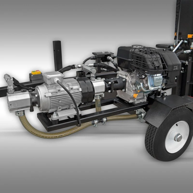 De hydraulische pomp wordt aangedreven door een zeer robuuste, hoogwaardige Kohler-benzinemotor van 6,5 pk of een krachtige elektromotor (400 V, 2,2 kW). U kunt vrij kiezen tussen elektrische aandrijving of benzineaandrijving..